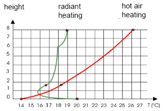 A hőenergiát közvetlenül a működési területre irányítja. A fűtött helyiségekben lévő levegő hőmérséklete mindig alacsonyabb, mint a hőérzet. Minimális az épület hővesztesége mindig magasabb, mint a hőérzet. Jelentős az épület hővesztesége, főleg a tetőn keresztül.
