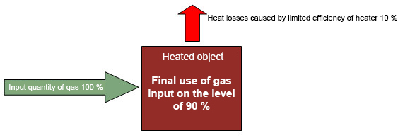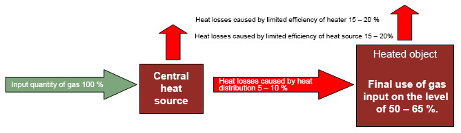 100% gáz ráfordítási mennyiség központi fűtés forrás A hő eloszlás általi hőveszteség 5-10% fűtött épület. A gáz végső felhasználása a bemenetnél 50-65%