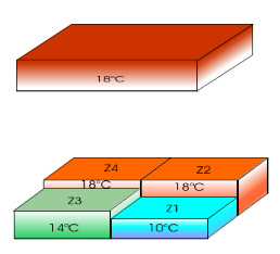 Különböző hőmérséklettel és időrendszerrel független hőmérsékleti zónákat is létre lehet hozni a fűtött helyiségekben anélkül, hogy szükséges legyen elkülöníteni őket bármilyen fallal. Kihasználva ezeket a fizikai különbségeket, a megtakarítás eredménye az energia 60-80% lehet.
